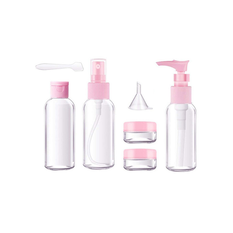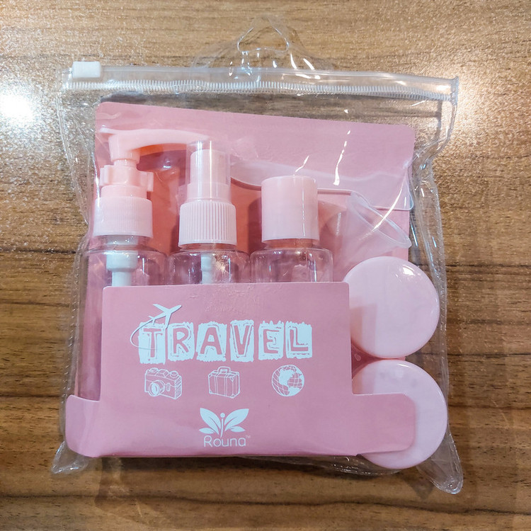 این پک 8 تکهای شامل :یک عدد بطری پمپی مناسب محصولاتی مانند لوسیون بدن، ژل و..، یک بطری اسپری مناسب برای عطر،تونر،الکل،فیس میست و...یک عدد بطری در دکمه ای مناسب برای شامپو،صابون مایع، نرم کننده های و.. دو عدد ظرف در پیچی مناسب برای کرم های دست، ماسک مو و.. و یک کاردک که برای ریختن کرم و لوسیون ها به داخل بطری ها مورد استفاده قرار میگیرد، یک قیف که برای وارد کردن مواد مایع به داخل این بطری ها کار را راحت تر میکند که در یک عدد کیف پلاستیکی شفاف با کیفیت زیپ دار برای حمل و نگهداری بطری ها قرار گرفته است.